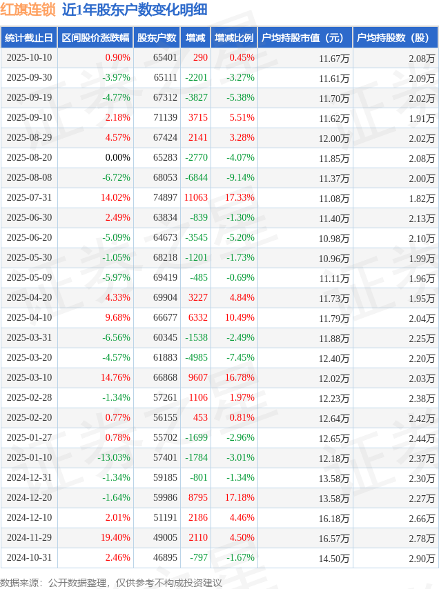从股价来看,2025年9月30日至2025年10月10日,红旗连锁区间涨幅为0.9%,在此期间股东户数增加290.0户,增幅为0.45%。