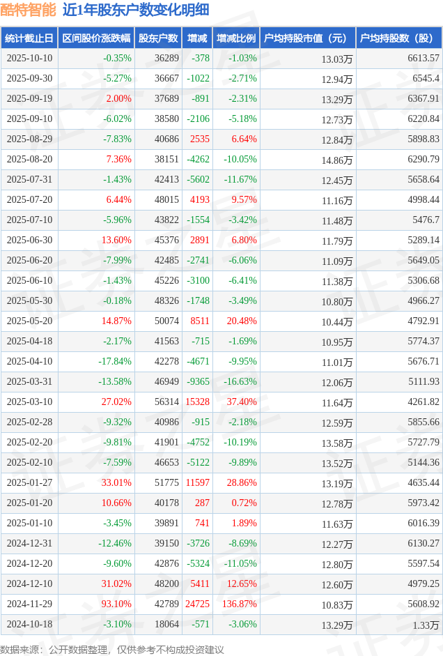 从股价来看,2025年9月30日至2025年10月10日,酷特智能区间跌幅为0.35%,在此期间股东户数减少378.0户,减幅为1.03%。