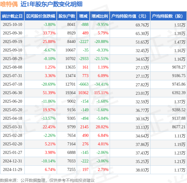 从股价来看,2025年9月30日至2025年10月10日,唯特偶区间跌幅为3.8%,在此期间股东户数减少888.0户,减幅为9.95%。