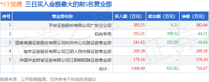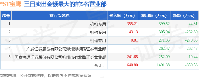 证券之星消息,沪深交易所2025年10月17日公布的交易公开信息显示,*ST宝鹰(002047)因连续三个交易日内,涨幅偏离值累计达到12%的ST证券、*ST证券和未完成股改证券登上龙虎榜。此次是近5个交易日内第1次上榜。