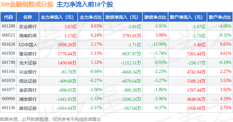 资金流向方面,300金融(000914)指数成份股当日主力资金净流出合计67.21亿元,游资资金净流入合计20.4亿元,散户资金净流入合计46.81亿元。成份股资金流向详情见下表: