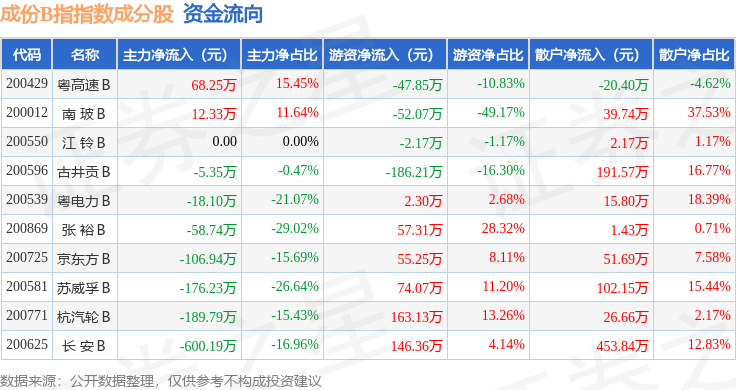 资金流向方面,成份B指(399003)指数成份股当日主力资金净流出合计1074.76万元,游资资金净流入合计210.12万元,散户资金净流入合计864.65万元。成份股资金流向详情见下表: