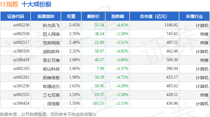 近10日内IT指数(399239)成份股做了调整,新纳入了2只股票,剔除了1只股票。