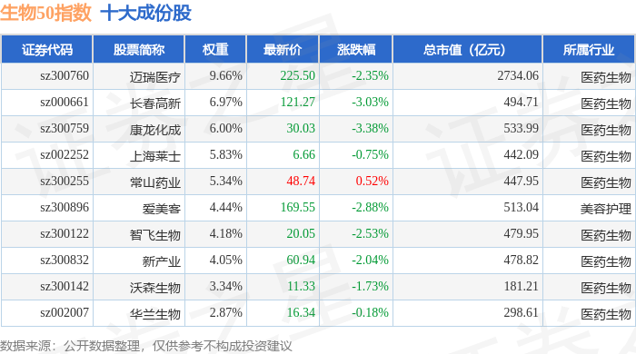 证券之星消息,10月17日,生物50(399280)指数报收于2159.61点,跌1.72%,成交139.26亿元,换手率2.24%。当日该指数成份股中,上涨的有7家,华兰疫苗以9.8%的涨幅领涨,下跌的有42家,新里程以4.49%的跌幅领跌。
