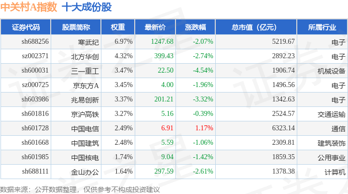 中关村A(399422)指数十大成份股详情如下: