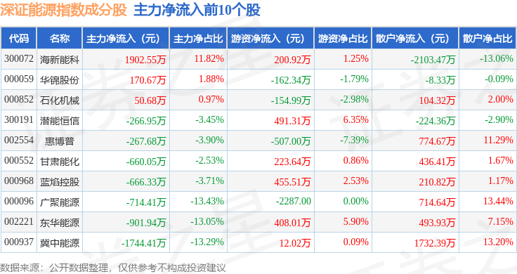 资金流向方面,深证能源(399613)指数成份股当日主力资金净流出合计1.93亿元,游资资金净流入合计8818.7万元,散户资金净流入合计1.05亿元。成份股资金流向详情见下表:
