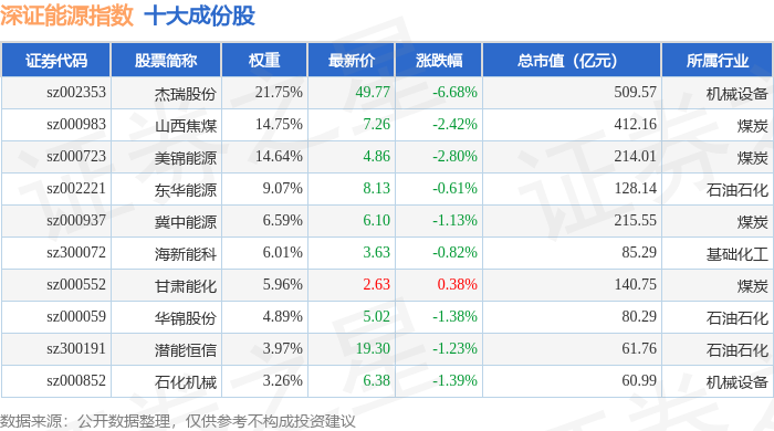 证券之星消息,10月17日,深证能源(399613)指数报收于3113.47点,跌2.54%,成交30.88亿元,换手率1.78%。当日该指数成份股中,上涨的有2家,蓝焰控股以0.56%的涨幅领涨,下跌的有11家,杰瑞股份以6.68%的跌幅领跌。