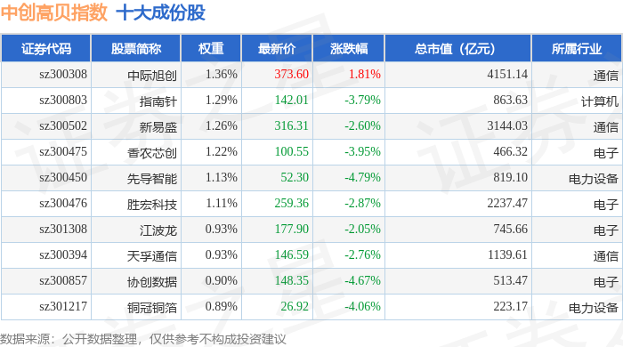 证券之星消息,10月17日,中创高贝(399666)指数报收于1866.62点,跌3.96%,成交2504.31亿元,换手率3.33%。当日该指数成份股中,上涨的有10家,迪普科技以4.1%的涨幅领涨,下跌的有190家,阳光电源以10.91%的跌幅领跌。