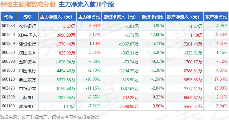 资金流向方面,保险主题(399809)指数成份股当日主力资金净流出合计20.38亿元,游资资金净流入合计1.43亿元,散户资金净流入合计18.95亿元。成份股资金流向详情见下表: