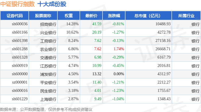 中证银行(399986)指数十大成份股详情如下: