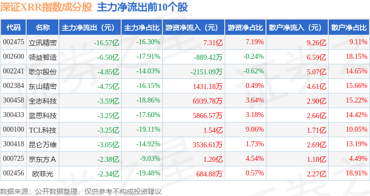 资金流向方面,深证XRR(470046)指数成份股当日主力资金净流出合计77.14亿元,游资资金净流入合计17.33亿元,散户资金净流入合计59.81亿元。成份股资金流向详情见下表: