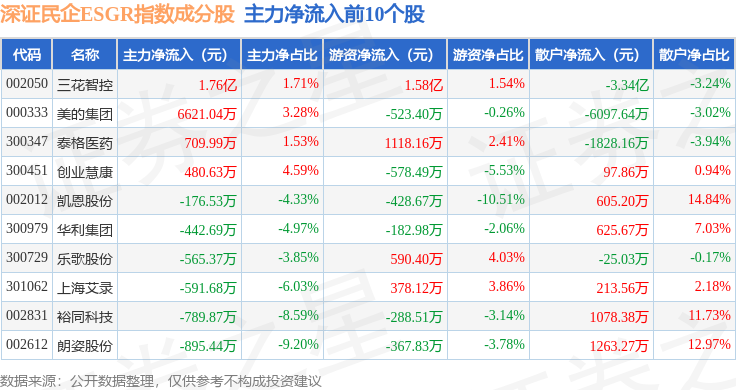 资金流向方面,深证民企ESGR(470056)指数成份股当日主力资金净流出合计120.06亿元,游资资金净流入合计40.56亿元,散户资金净流入合计79.49亿元。成份股资金流向详情见下表: