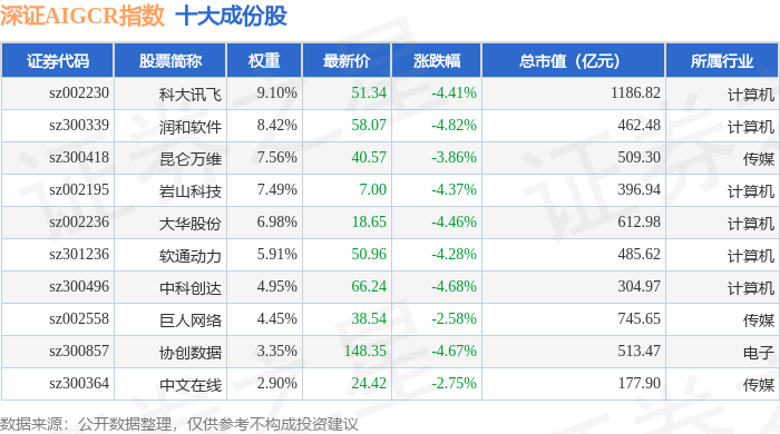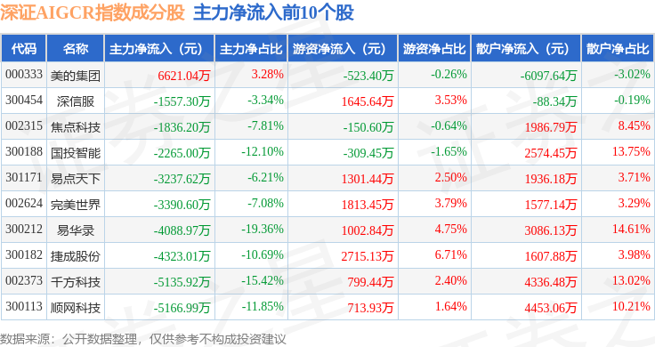 资金流向方面,深证AIGCR(470075)指数成份股当日主力资金净流出合计53.84亿元,游资资金净流入合计14.39亿元,散户资金净流入合计39.45亿元。成份股资金流向详情见下表: