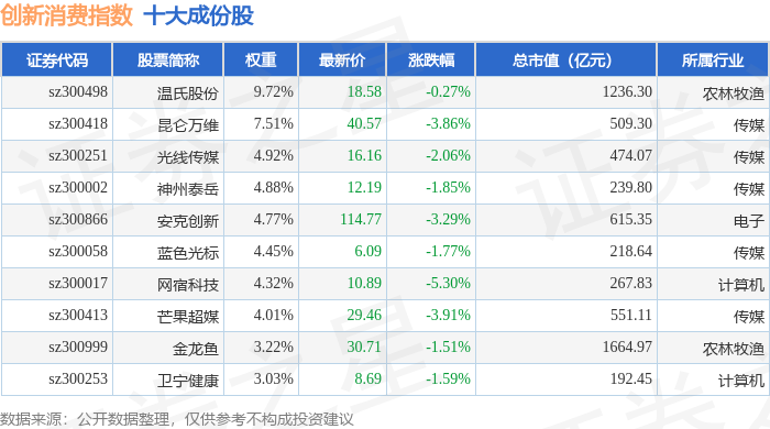 创新消费(970041)指数十大成份股详情如下: