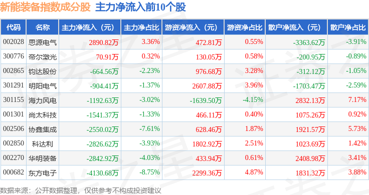 资金流向方面,新能装备(970043)指数成份股当日主力资金净流出合计101.98亿元,游资资金净流入合计18.02亿元,散户资金净流入合计83.96亿元。成份股资金流向详情见下表:
