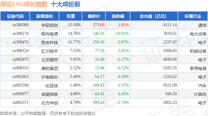 证券之星消息,10月17日,深证ESG成长(970060)指数报收于1981.75点,跌3.83%,成交1069.04亿元,换手率2.19%。当日该指数成份股中,上涨的有5家,光库科技以5.17%的涨幅领涨,下跌的有45家,阳光电源以10.91%的跌幅领跌。