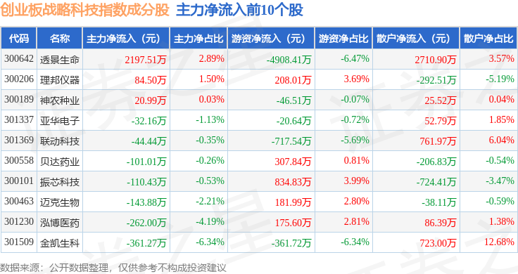 资金流向方面,创业板战略科技(971004)指数成份股当日主力资金净流出合计34.21亿元,游资资金净流入合计6.92亿元,散户资金净流入合计27.29亿元。成份股资金流向详情见下表: