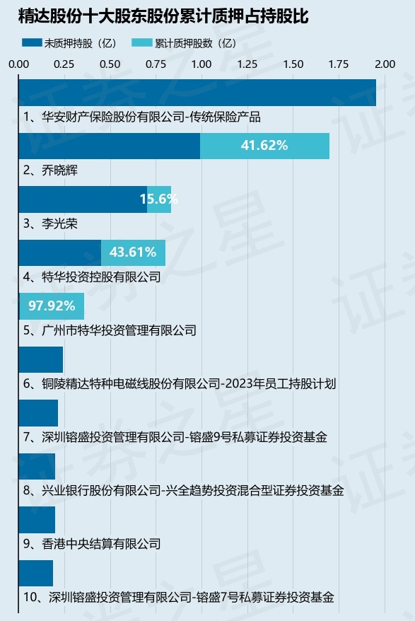 截止本公告日,股东乔晓辉已累计质押股份7076.0万股,占其持股总数的41.62%,股东李光荣已累计质押股份1300.0万股,占其持股总数的15.6%,股东特华投资控股有限公司已累计质押股份3500.0万股,占其持股总数的43.61%,股东广州市特华投资管理有限公司已累计质押股份3500.0万股,占其持股总数的97.92%。本次质押后精达股份十大股东的累计质押股份占持股比例(占持股比例的计算以公司最新一期财务报表公布的十大股东的持股总数为基准)见下图: