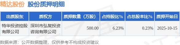 证券之星消息,精达股份(600577)10月17日公开信息显示,股东特华投资控股有限公司向深圳市弘复投资咨询有限公司合计质押500.0万股,占总股本0.23%。质押详情见下表: