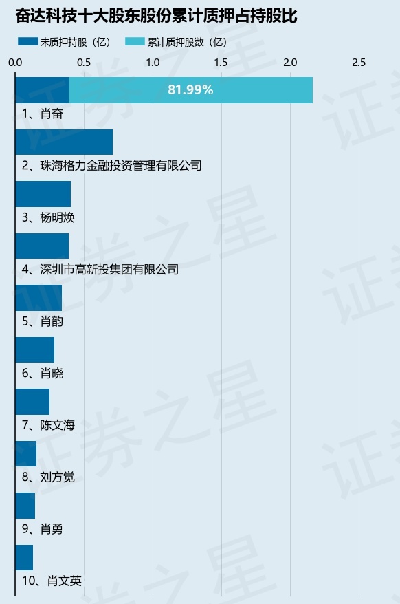 截止本公告日,股东肖奋已累计质押股份1.77亿股,占其持股总数的81.99%。本次质押后奋达科技十大股东的累计质押股份占持股比例(占持股比例的计算以公司最新一期财务报表公布的十大股东的持股总数为基准)见下图: