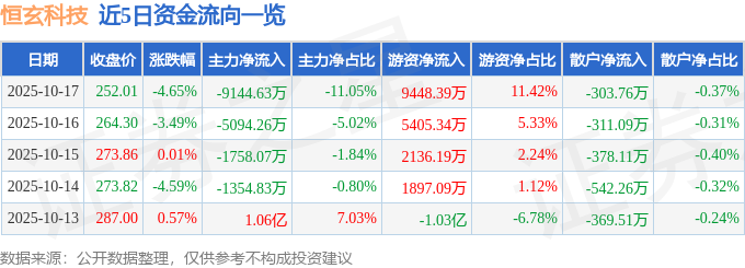 证券之星消息,截至2025年10月17日收盘,恒玄科技(688608)报收于252.01元,下跌4.65%,换手率1.91%,成交量3.22万手,成交额8.28亿元。