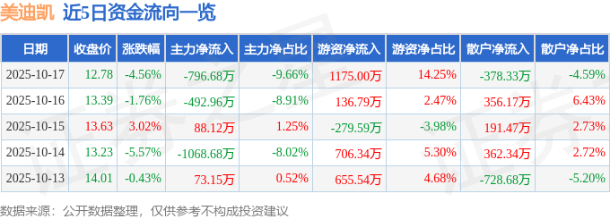 证券之星消息,截至2025年10月17日收盘,美迪凯(688079)报收于12.78元,下跌4.56%,换手率1.59%,成交量6.34万手,成交额8247.44万元。