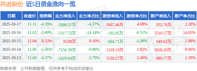 证券之星消息,截至2025年10月17日收盘,共进股份(603118)报收于11.11元,下跌4.39%,换手率4.55%,成交量35.78万手,成交额4.08亿元。