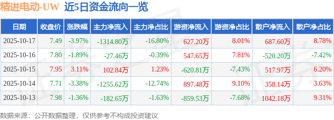 证券之星消息,截至2025年10月17日收盘,精进电动(688280)报收于7.49元,下跌3.97%,换手率1.97%,成交量10.26万手,成交额7827.36万元。