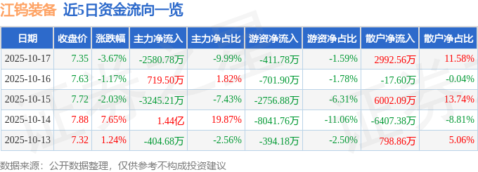 证券之星消息,截至2025年10月17日收盘,江钨装备(600397)报收于7.35元,下跌3.67%,换手率3.47%,成交量34.4万手,成交额2.58亿元。