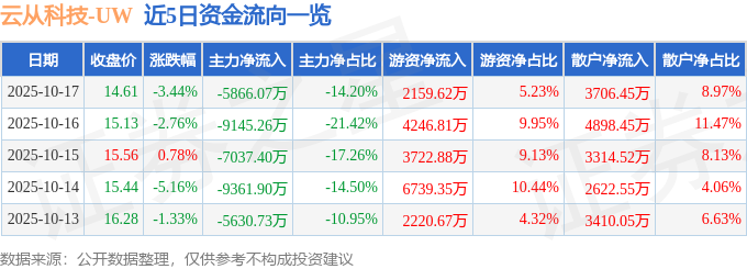 证券之星消息,截至2025年10月17日收盘,云从科技(688327)报收于14.61元,下跌3.44%,换手率3.33%,成交量27.79万手,成交额4.13亿元。