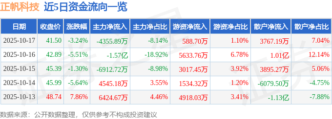 证券之星消息,截至2025年10月17日收盘,正帆科技(688596)报收于41.5元,下跌3.24%,换手率4.35%,成交量12.75万手,成交额5.35亿元。