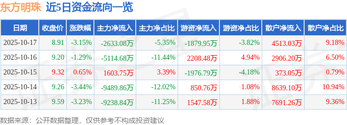 证券之星消息,截至2025年10月17日收盘,东方明珠(600637)报收于8.91元,下跌3.15%,换手率1.62%,成交量54.38万手,成交额4.92亿元。