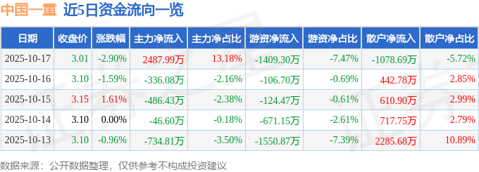 证券之星消息,截至2025年10月17日收盘,中国一重(601106)报收于3.01元,下跌2.9%,换手率0.91%,成交量62.08万手,成交额1.89亿元。