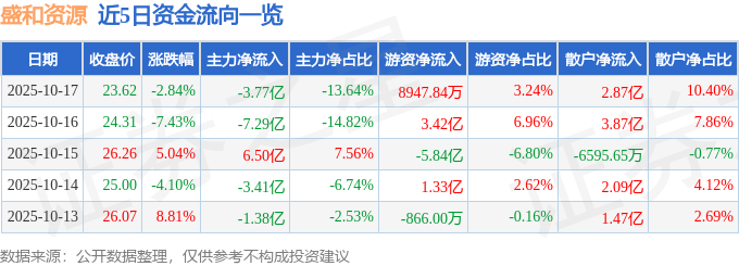 证券之星消息,截至2025年10月17日收盘,盛和资源(600392)报收于23.62元,下跌2.84%,换手率6.53%,成交量114.54万手,成交额27.61亿元。