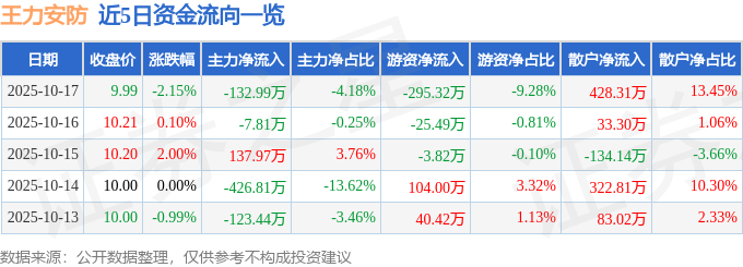 证券之星消息,截至2025年10月17日收盘,王力安防(605268)报收于9.99元,下跌2.15%,换手率0.72%,成交量3.15万手,成交额3184.01万元。
