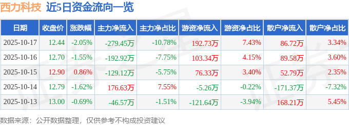 证券之星消息,截至2025年10月17日收盘,西力科技(688616)报收于12.44元,下跌2.05%,换手率1.15%,成交量2.07万手,成交额2593.48万元。