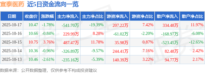 证券之星消息,截至2025年10月17日收盘,宣泰医药(688247)报收于10.47元,下跌1.78%,换手率0.58%,成交量2.64万手,成交额2793.37万元。