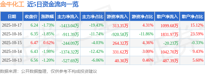 证券之星消息,截至2025年10月17日收盘,金牛化工(600722)报收于6.24元,下跌1.73%,换手率1.7%,成交量11.55万手,成交额7272.92万元。
