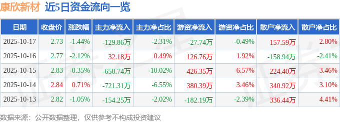 10月17日的资金流向数据方面,主力资金净流出129.86万元,占总成交额2.31%,游资资金净流出27.74万元,占总成交额0.49%,散户资金净流入157.59万元,占总成交额2.8%。