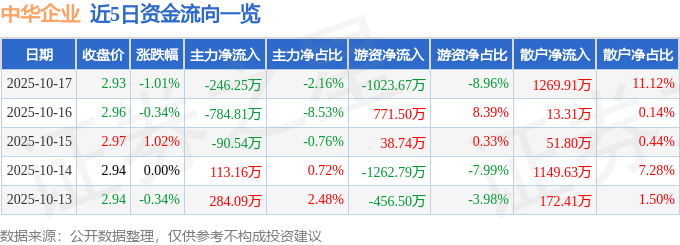 10月17日的资金流向数据方面,主力资金净流出246.25万元,占总成交额2.16%,游资资金净流出1023.67万元,占总成交额8.96%,散户资金净流入1269.91万元,占总成交额11.12%。
