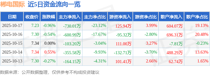10月17日的资金流向数据方面,主力资金净流出730.01万元,占总成交额23.12%,游资资金净流入125.94万元,占总成交额3.99%,散户资金净流入604.07万元,占总成交额19.13%。