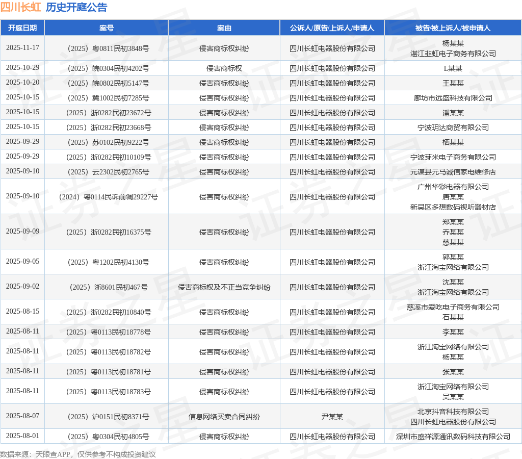 案号:(2025)皖0802民初5147号根据统计,近一年内以四川长虹电器股份有限公司为当事人的历史开庭公告有90则,其中案由为“侵害商标权纠纷”的公告以59则居首,其次为“劳动争议”有12则,“劳动合同纠纷”有4则。历史开庭公告(前20条)如下: