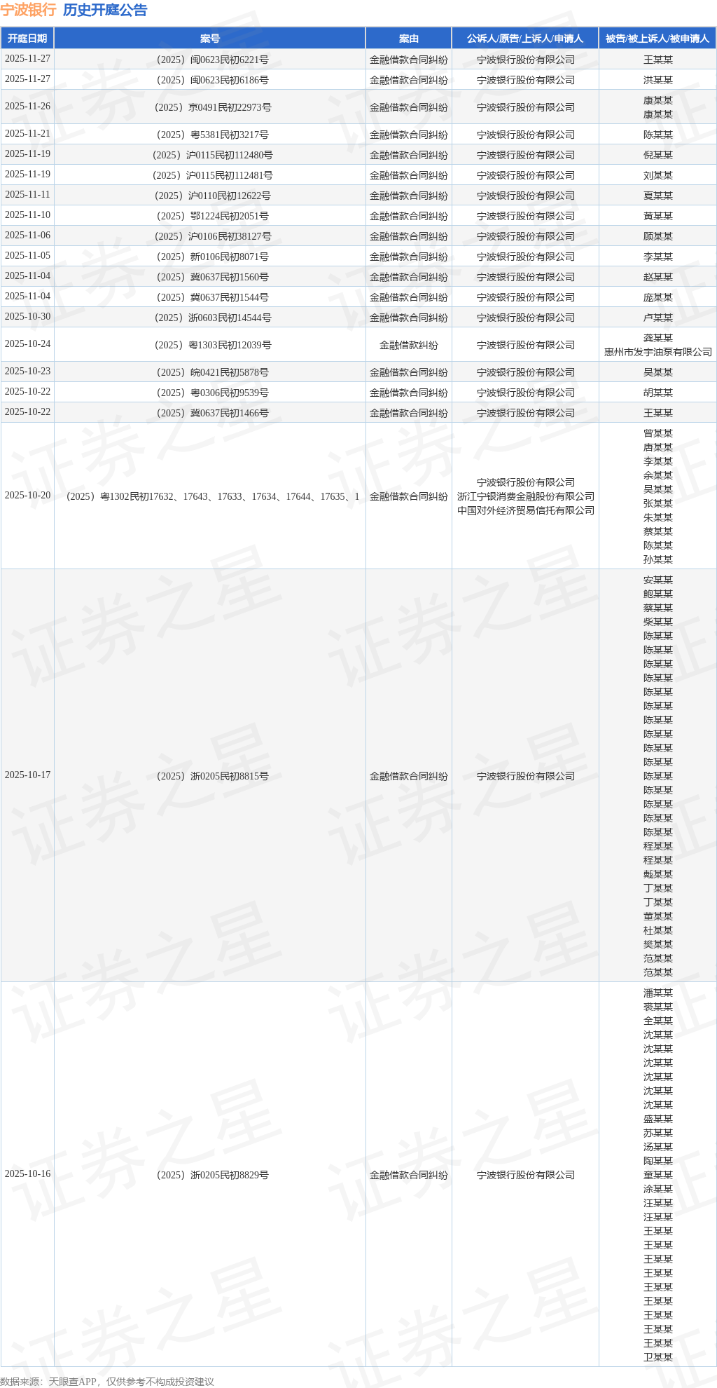 案号:(2025)粤1302民初17632、17643、17633、17634、17644、17635、1根据统计,近一年内以宁波银行股份有限公司为当事人的历史开庭公告有1878则,其中案由为“金融借款合同纠纷”的公告以1653则居首,其次为“借款”有133则,“借款合同纠纷”有54则。历史开庭公告(前20条)如下: