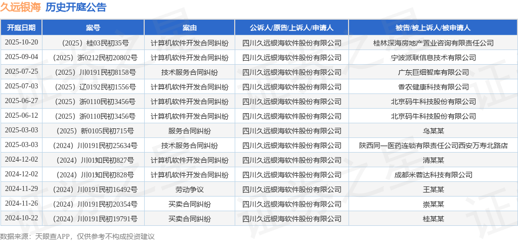 案号:(2025)桂03民初35号根据统计,近一年内以四川久远银海软件股份有限公司为当事人的历史开庭公告有13则,其中案由为“计算机软件开发合同纠纷”的公告以7则居首,其次为“买卖合同纠纷”有2则,“技术服务合同纠纷”有2则。历史开庭公告如下: