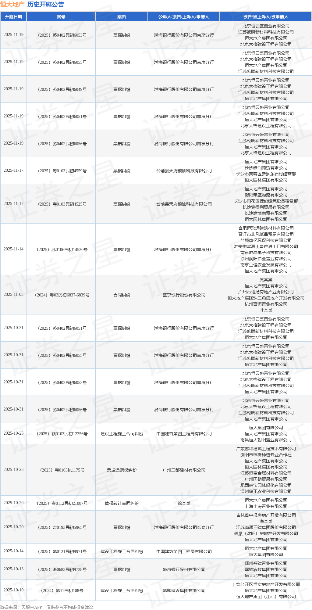 案号:(2025)吉0193民初5965号根据统计,近一年内以恒大地产集团有限公司为当事人的历史开庭公告有1023则,其中案由为“票据纠纷”的公告以291则居首,其次为“合同纠纷”有201则,“建设工程施工合同纠纷”有163则。历史开庭公告(前20条)如下: