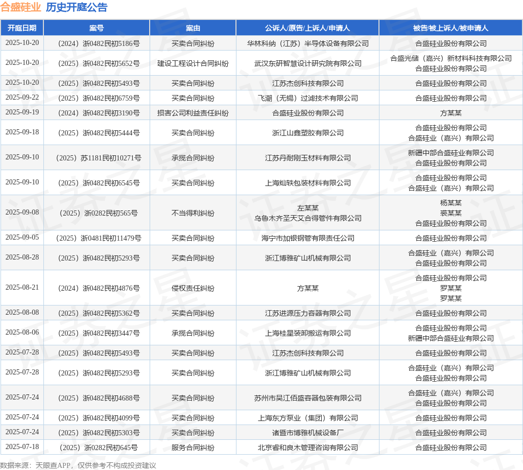 案号:(2025)浙0482民初5652号根据统计,近一年内以合盛硅业股份有限公司为当事人的历史开庭公告有35则,其中案由为“买卖合同纠纷”的公告以25则居首,其次为“不当得利纠纷”有3则,“承揽合同纠纷”有2则。历史开庭公告(前20条)如下:
