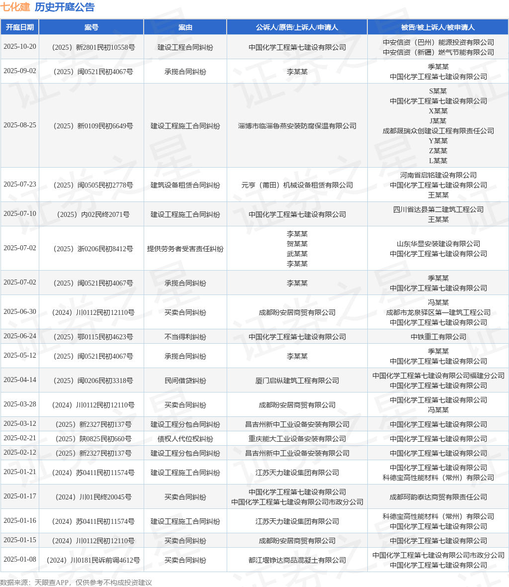 案号:(2025)新2801民初10558号根据统计,近一年内以中国化学工程第七建设有限公司为当事人的历史开庭公告有45则,其中案由为“劳务合同纠纷”的公告以15则居首,其次为“买卖合同纠纷”有7则,“建设工程施工合同纠纷”有5则。历史开庭公告(前20条)如下: