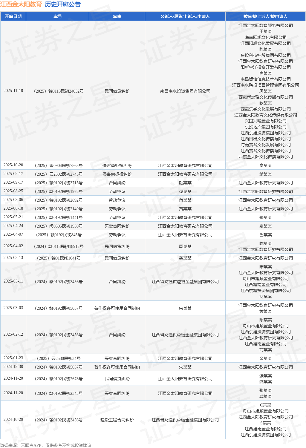 案号:(2025)粤0904民初7863号根据统计,近一年内以江西金太阳教育研究有限公司为当事人的历史开庭公告有23则,其中案由为“劳动争议”的公告以6则居首,其次为“民间借贷纠纷”有5则,“买卖合同纠纷”有3则。历史开庭公告(前20条)如下: