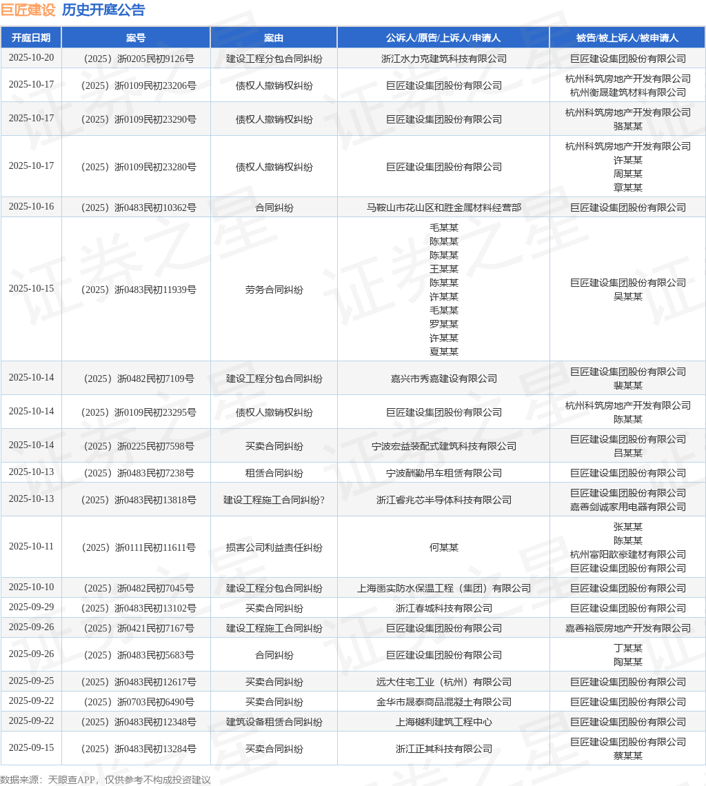 案号:(2025)浙0205民初9126号根据统计,近一年内以巨匠建设集团股份有限公司为当事人的历史开庭公告有238则,其中案由为“买卖合同纠纷”的公告以79则居首,其次为“合同纠纷”有36则,“建设工程施工合同纠纷”有34则。历史开庭公告(前20条)如下: