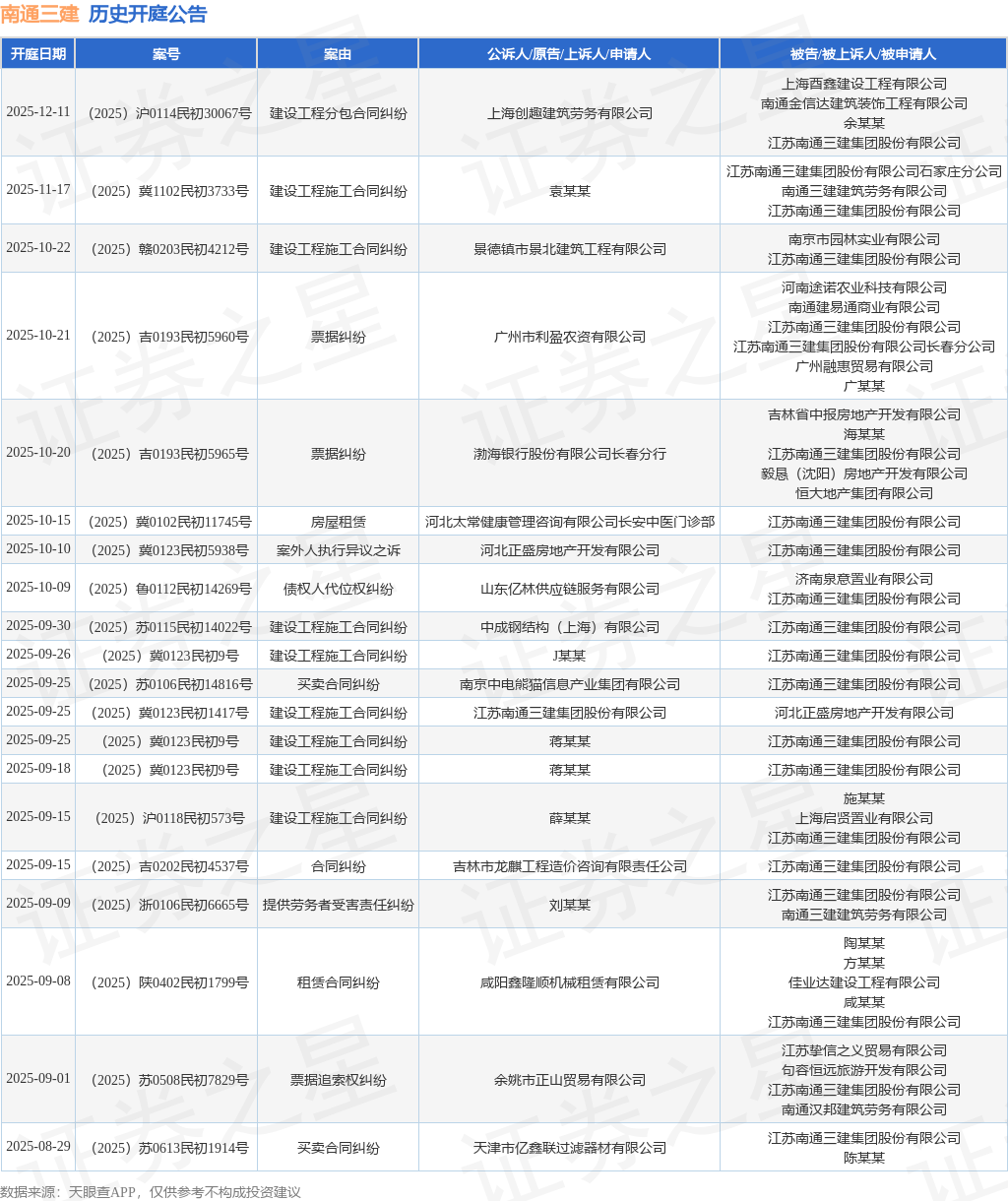 案号:(2025)吉0193民初5965号根据统计,近一年内以江苏南通三建集团股份有限公司为当事人的历史开庭公告有436则,其中案由为“买卖合同纠纷”的公告以103则居首,其次为“建设工程施工合同纠纷”有80则,“票据追索权纠纷”有62则。历史开庭公告(前20条)如下: